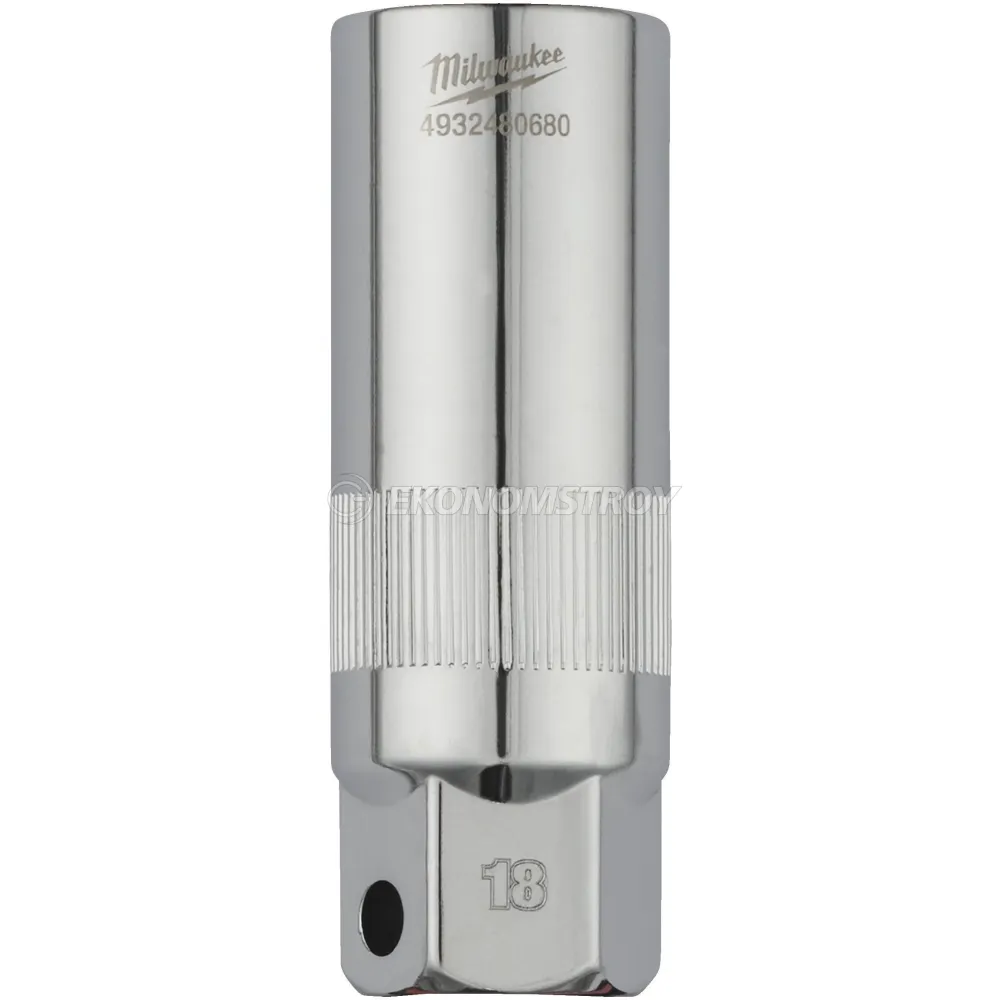 Milwaukee Головка торцевая свечная Milwaukee 4932480680 3/8"-18мм (длина: 68мм, резиновый фиксатор, штампованные размеры, отверстие для штифта)