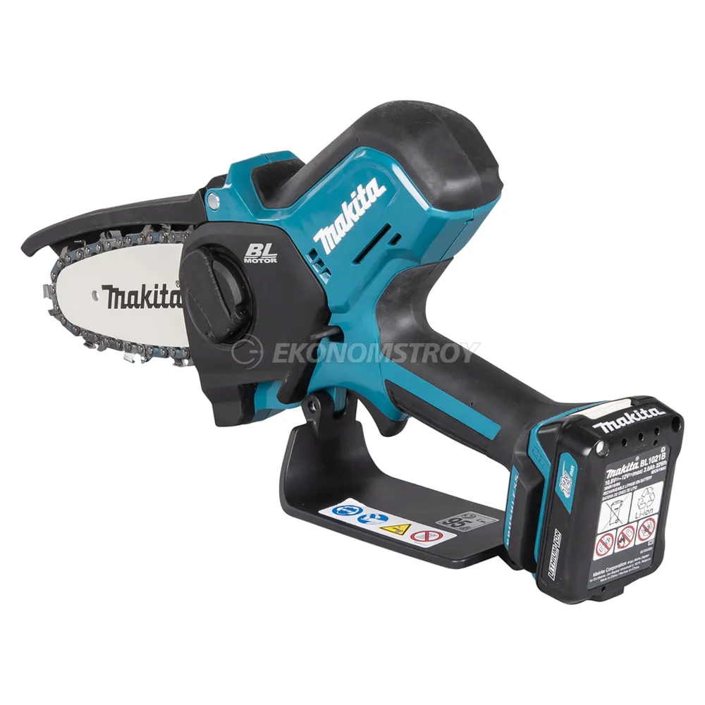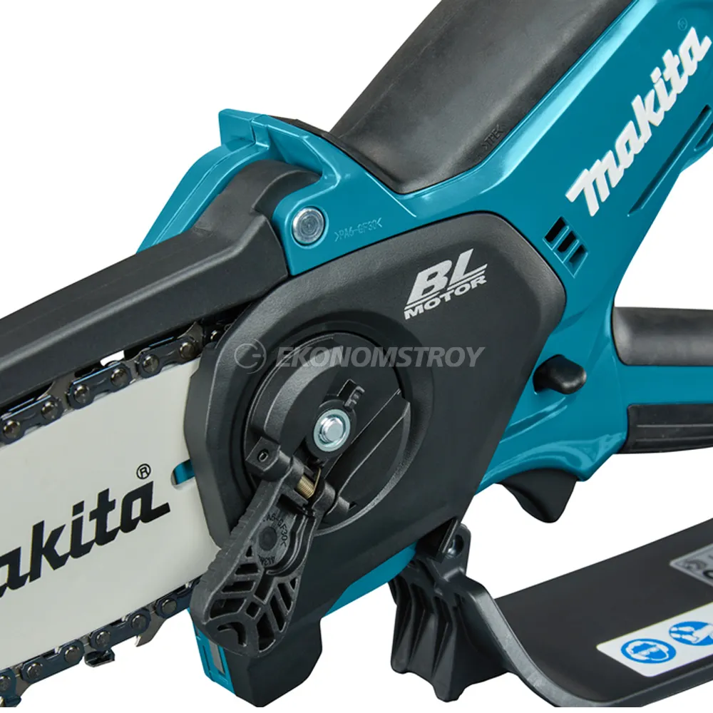 Makita представляет новую цепную пилу для частного применения UC100DWA. Данная цепная пила оснащена бесщеточным двигателем, который выдает максимальную мощность до 320 Вт. Максимальная скорость цепи составляет 8 м/с, а длина шины 10 см. Режущая гарнитура оснащена автоматической подачей масла, объем масленого бака 55 мл. Бесключевое натяжение цепи позволит быстро подтянуть провисшую цепь. Если цепь соскочит с шины, то широкая планка защитит пальцы пользователя.